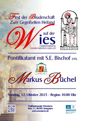 Zum Bruderschaftsfest 2025 am zweiten Oktoberwochenende begrüßen wir den Bischof em. von St. Gallen (CH), S.E. Markus Büchel. Bischof Büchel ist seit vielen Jahren Mitglied der Bruderschaft „Zum Gegeißelten Heiland auf der Wies“ und wird mit uns das Pontifikalamt feiern.