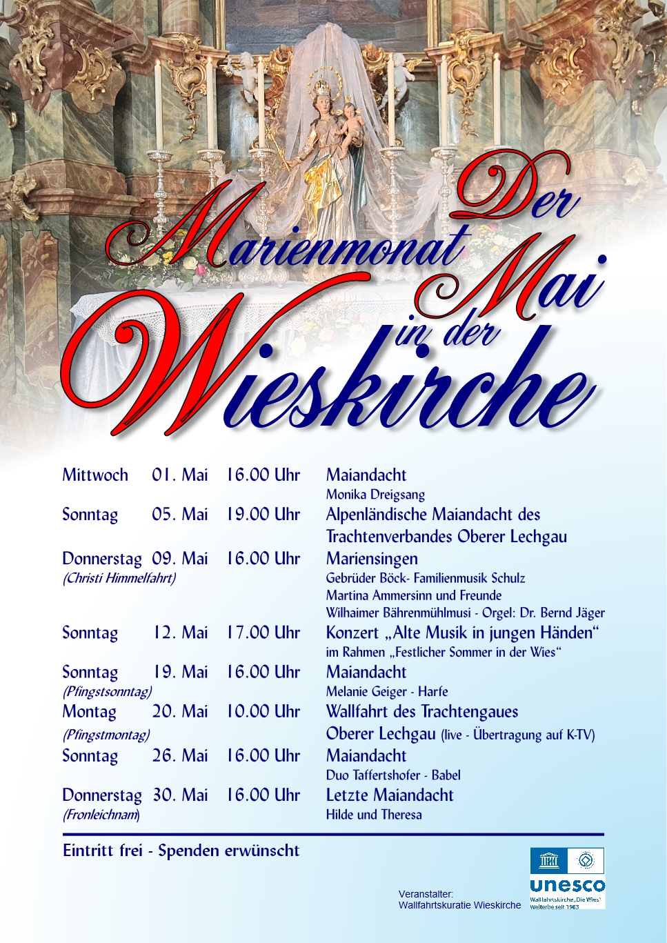 Im Jahr besuchen eine Million Menschen aus der ganzen Welt die Wies – und sie kommen aus dem Staunen nicht mehr heraus: die wunderbaren Formen und Farben, die lichtvolle Heiterkeit des Raumes, die tiefreligiöse Frömmigkeit der Darstellungen – und dann die Erfahrung von schöner Musik – das alles wird zu einem beglückenden Gesamterlebnis »Wunder Wies«.